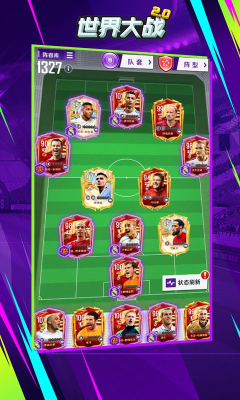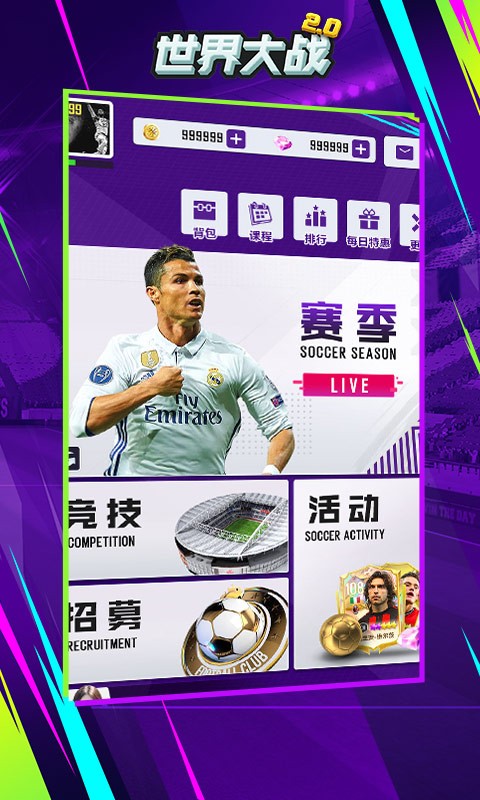 欢迎加入《世界大战2.0》,全新玩法等您开启!在这里您将化身为球队经理,真实模拟球队运营,自由搭配球队阵型和引援,球馆球场球员全方面都由你来定制!打造一支属于你的冠军之师!更有诸多福利活动等待你来参与!各位优秀的经理人,快来《世界大战2.0》打造你的豪门阵容吧!